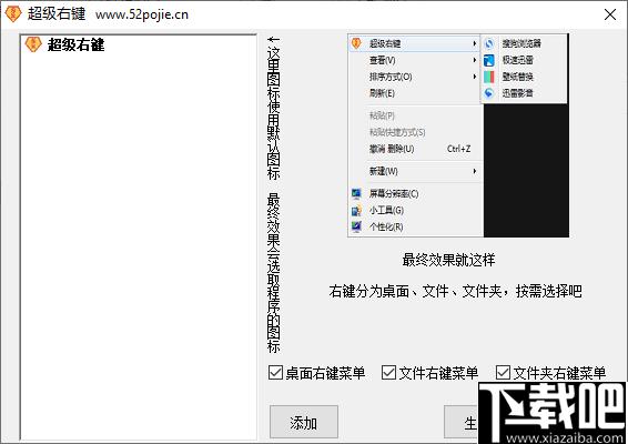 3、选择好菜单后点击“添加”按钮创建右键菜单功能。
